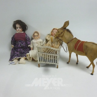 3 div. Puppen und 1 Esel-Figur