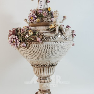 Prunk-Deckelvase mit Putti Blumendekor,