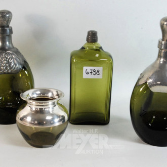 3 farbige Karaffen, tlw. mit Metall-