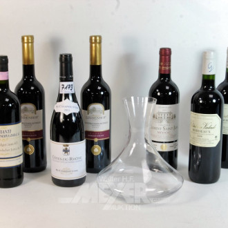 7 Flaschen Rotwein und 1 Dekanter ''WMF''