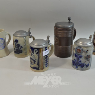 6 Keramik-Bierkrüge, tlw. mit Zinndeckeln