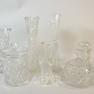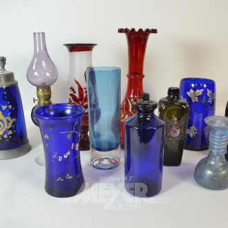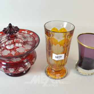 3 Teile Buntglas: Deckeldose, 2 Vasen