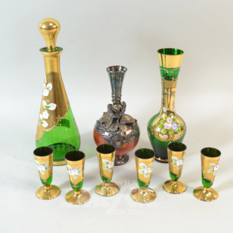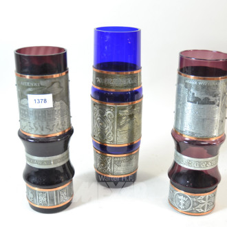 3 farb. Glas-Vasen mit Zinn-Montierung