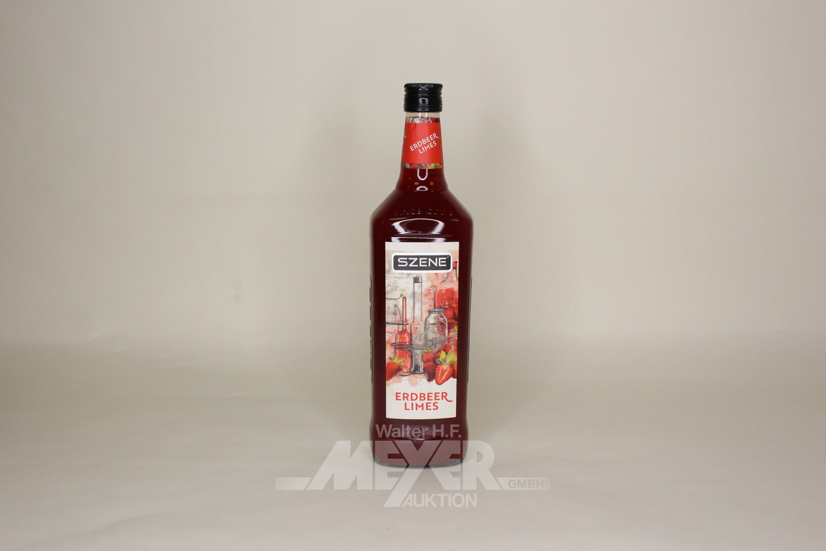Gammeldansk Bitter Dram, Martini Extra Dry, Pampelle Ruby l'Apéro, XUXU Erdbeerlikör mit Wodka, Sasse Williams Edelbrand, Giffard Erdbeersirup (ohne Alkohol)