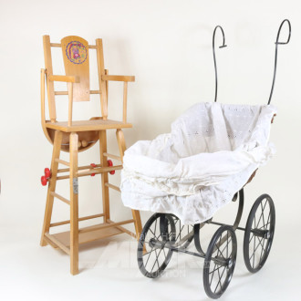 2 Puppenwagen und 1 Puppenhochstuhl, Holz