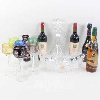 6 versch. farbige Weingläser, Karaffe, Obstschale, Vase