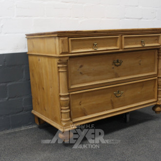 Weichholz, Breite: 100 cm, Höhe: 72 cm, Tiefe: 55 cm, Gründerzeitstil, mit gedrehten Säulen, 4 Züge, Messingbeschläge