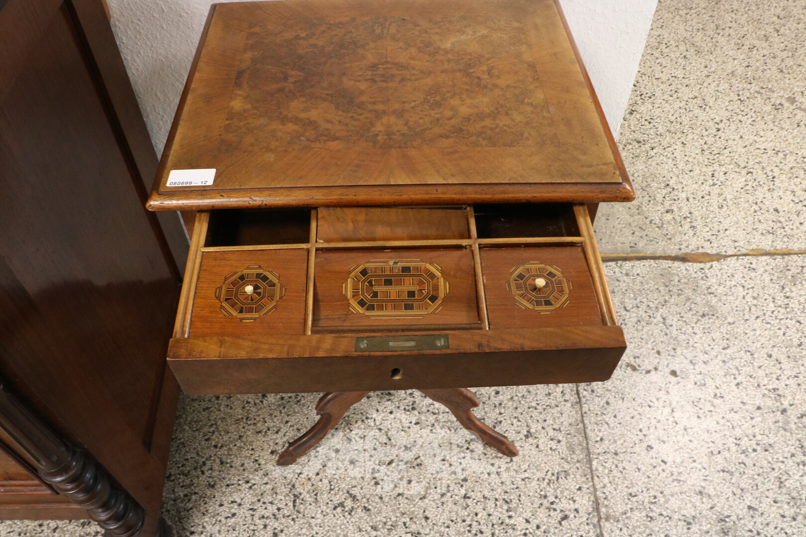 Mahagoni, Alter / Epoche: 19. Jh., Höhe: 77 cm, 2 Züge, abklappbare Seiten, Säulenfuß, Bandintarsien, Furnierschäden