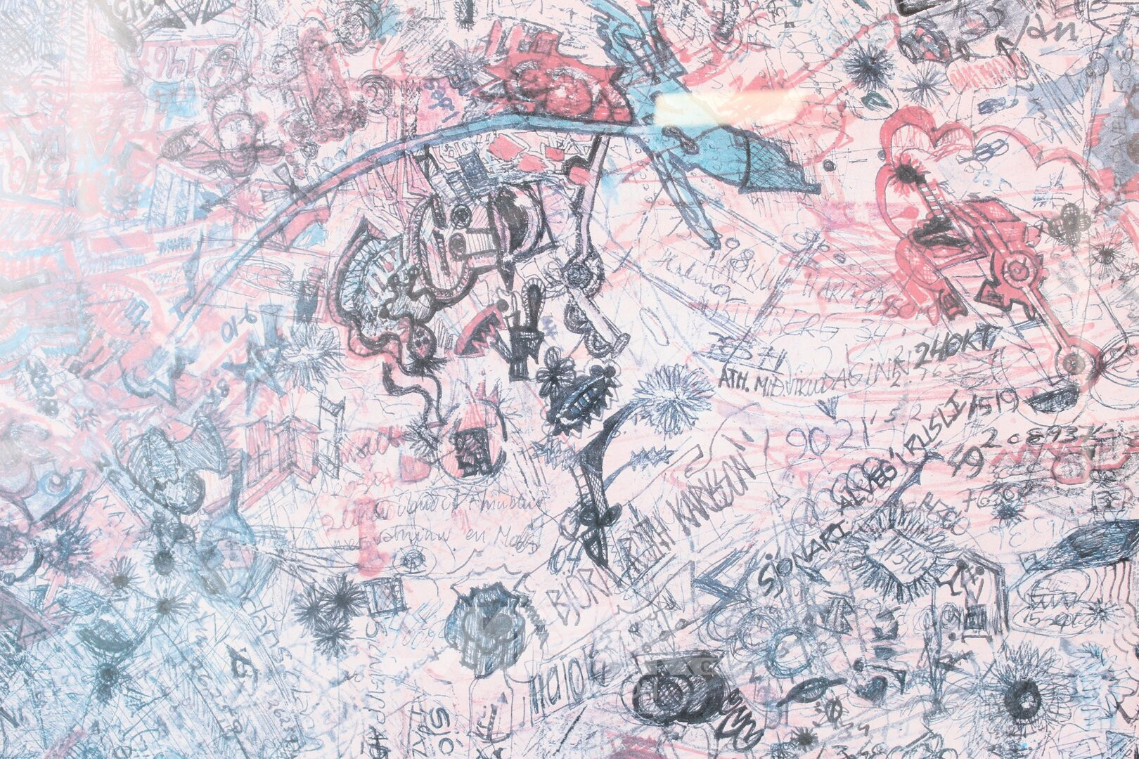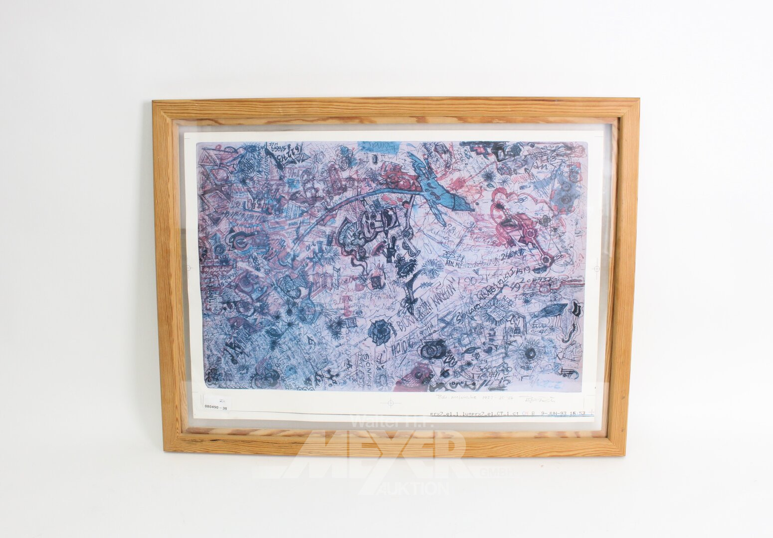 rückseitig bez., Bürmann, Frank (*1964), Material: Acryl/Lwd., 2015, 90 x 130 cm, rahmenlos, Frank Bürmann - ehemals tätig als Polizist - begann im Jahr 1989 als freischaffender Künstler zu arbeiten. Eine schwere Erkrankung führte ihn zeitweise in den Rollstuhl und inspirierte ihn zu seinen ersten bekannten Werkserien, darunter Skulpturen aus Stühlen, die 1992 in Hildesheim gezeigt wurden. Internationale Aufmerksamkeit erhielt er 1993 mit dem Bilderzyklus „Kleiner Könich“ - eine Kooperationsarbeit mit u.a. James Rizzi. 1998 reiste seine Zeichnung „Weltraumtraumraum“ mit einer Sojus-Mission zur Raumstation MIR und kehrte signiert zurück. Neben seiner künstlerischen Tätigkeit engagierte er sich früh für soziale Projekte, unter anderem für aidskranke Kinder und als Kinderbotschafter Niedersachsens. Seit 2006 prägt er mit dem Projekt „The Art of Hamburg“ eine Kunstform, die Alltagsgegenstände wie Kleidung und Taschen zu einzigartigen Kunstwerken macht. Bürmann verbindet in seinem Schaffen stets Kreativität mit gesellschaftlichem Engagement und gilt damit als ein Künstler, der Kunst und Alltag auf besondere Weise vereint.